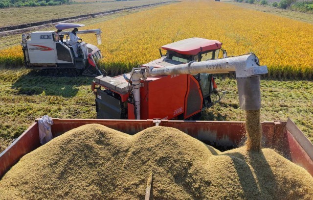 11月5日,江苏省农垦农业发展股份有限公司南通分公司收割机卸运刚刚收割的水稻(无人机照片)。