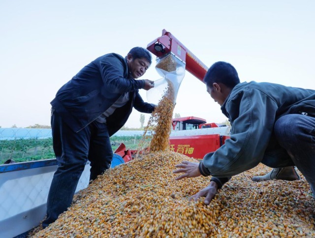 10月13日,山西省运城市万荣县里望乡村民趁着晴好天气抢收玉米。新华社发(闫鑫摄)