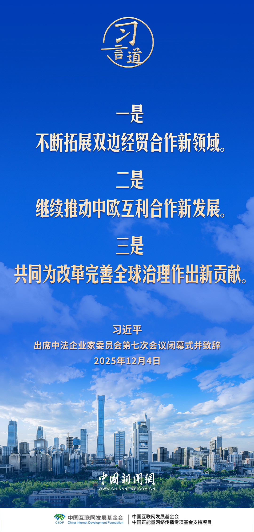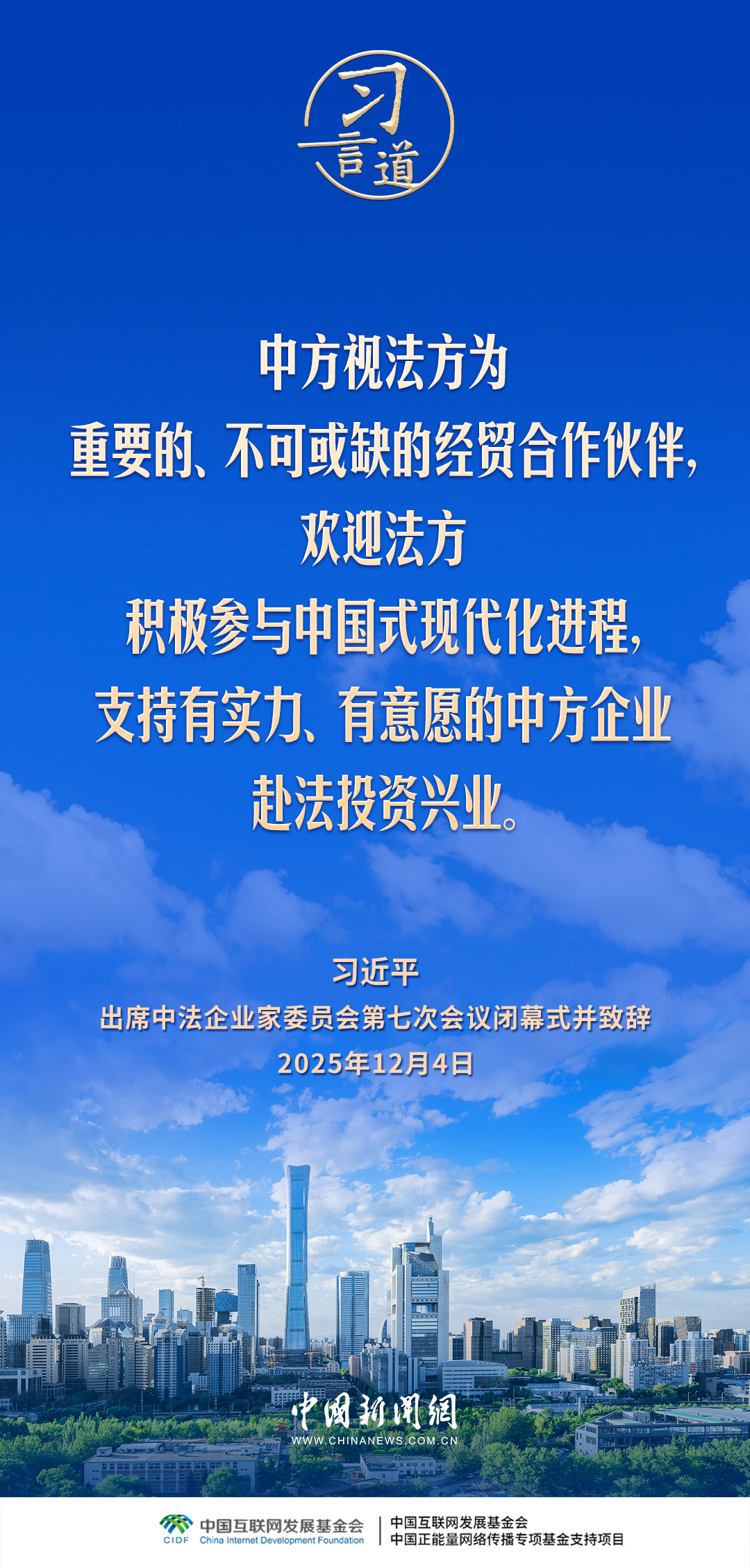 12月4日,国家主席习近平在北京同法国总统马克龙共同出席中法企业家委员会第七次会议闭幕式并致辞。习近平指出——
